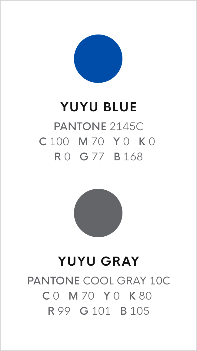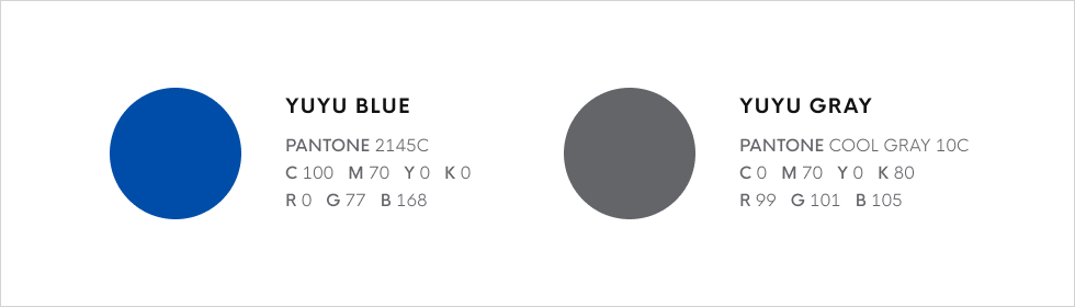 로고타입의 시각 요소로 가장 우선되는 대표 색상은 YUYU BLUE, YUYU GRAY 이며, 지정된 PANTONE 2145C / COOL GRAY 10C 로 적용합니다.