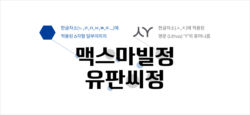 ‘유유서체’의 기본 컨셉은 제약기업의 핵심역량인 신약연구의 기본 토대인 화학식을 표현하는 6각형 벤젠핵 구조와 인간성이 느껴지는 ‘y’자 영문이니셜의 특징을 글꼴의 기본 특징으로 담았습니다. 각형은 한글 자소 ‘ㄴ,ㄹ,ㅁ,ㅂ,ㅃ,ㅌ..’등에서 꺾임 부분에 적용되었고, 영문 ‘y’의 휴머니즘 형태는 자소 ‘ㅆ, ㅉ’등에 적용하였습니다.