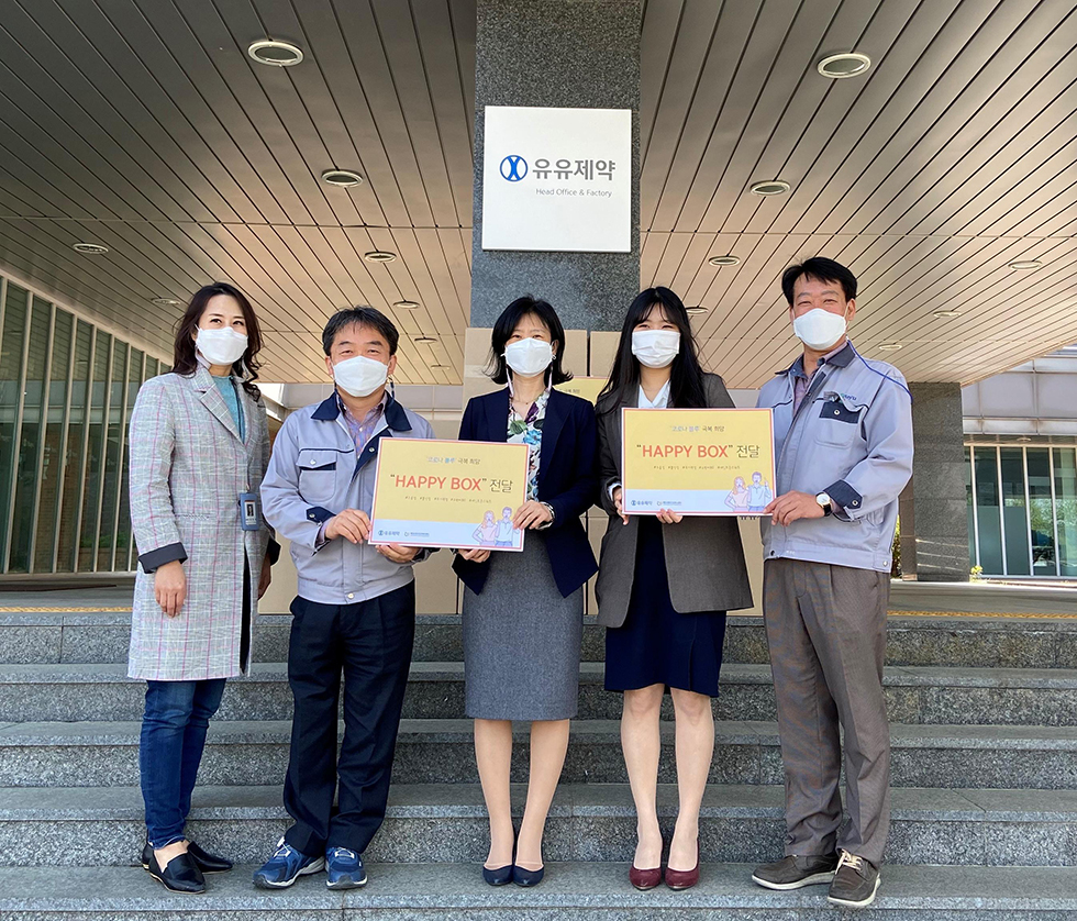 유유제약이 준비한 해피박스는 불안과 우울감 해소에 도움을 주는 세인트존스워트 꽃차와 제한된 야외활동으로 부족해질 수 있는 비타민 보충을 도와주는 유판씨, KF94 마스크로 구성되었으며 서울 중구, 경기 안산, 충북 제천 정신건강복지센터에 전달되었다.