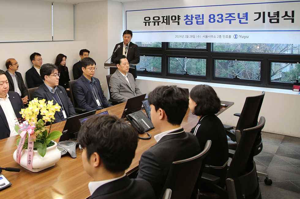 유유제약(대표이사 유원상, 박노용)이 28일 서울 사무소와 제천 공장, 광교 연구소 및 전국 영업지점을 화상으로 연결하여 창립 83주년 기념식을 진행했다.