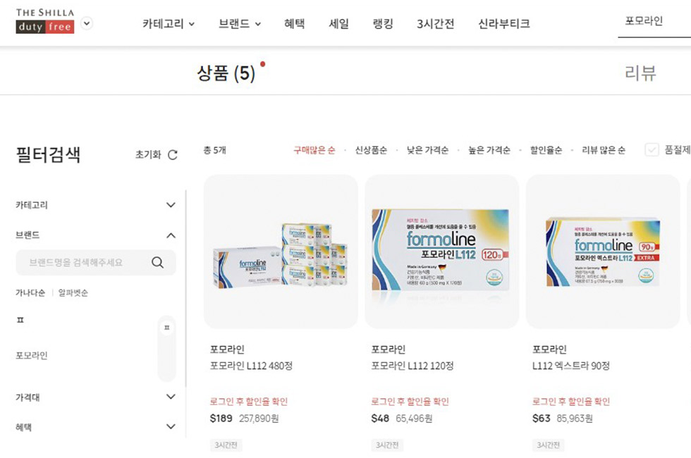 신라 온라인 면세점을 통해 선보이는 ‘포모라인 L112 오리지널’은 60, 120, 240, 480정 4종이며, 함량이 업그레이드 된 포모라인L112 엑스트라 제품(90정)도 판매한다. 특히 신라면세점 단독 패키지로 구성된 240정 패키지와 480정 패키지는 각각 96USD, 189USD로 구성되어 시중가보다 저렴하게 구매 가능하다