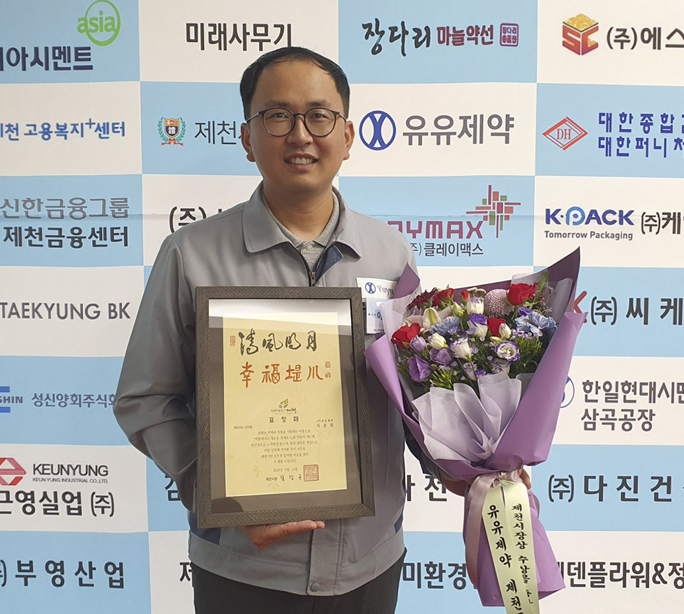 이준희 매니저는 유유제약 제천공장에서 장기근속하며 지역 인재 채용 및 사회 공헌, 노사화합 등에 기여한 공로를 인정받아 제천시장상을 수여 받았다.