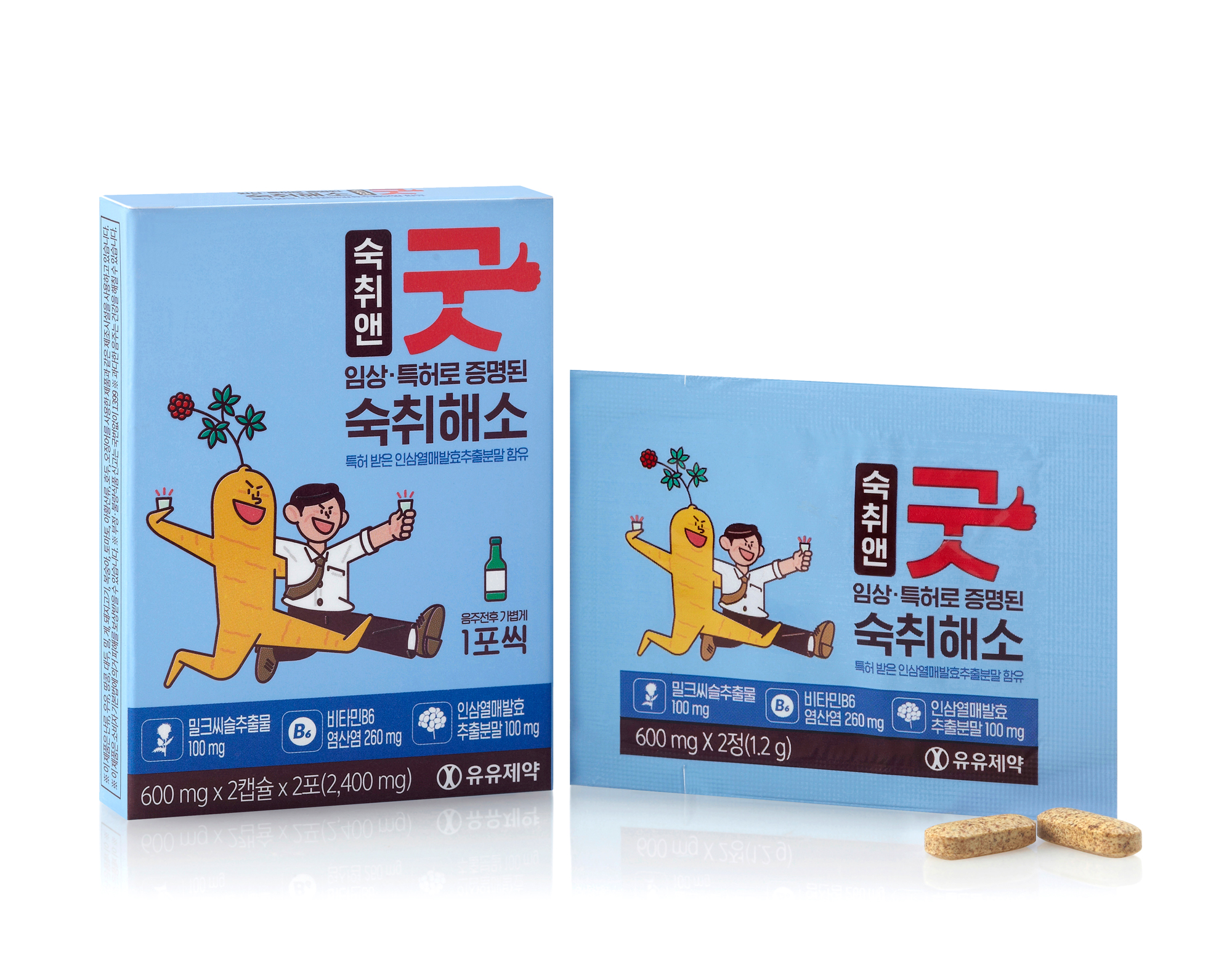 유유제약이 숙취해소제 ‘숙취앤굿’을 출시하며 2,000억 규모로 추산되는 숙취해소 시장에 뛰어들었다. 숙취앤굿은 한국∙미국 특허 등록 및 국제 학술지에 연구결과가 게재된 인삼열매 발효추출물을 주성분으로 밀크씨슬, 헛개나무, 강황 등 숙취 개선 및 간 보호에 도움을 주는 다양한 성분으로 구성됐다.