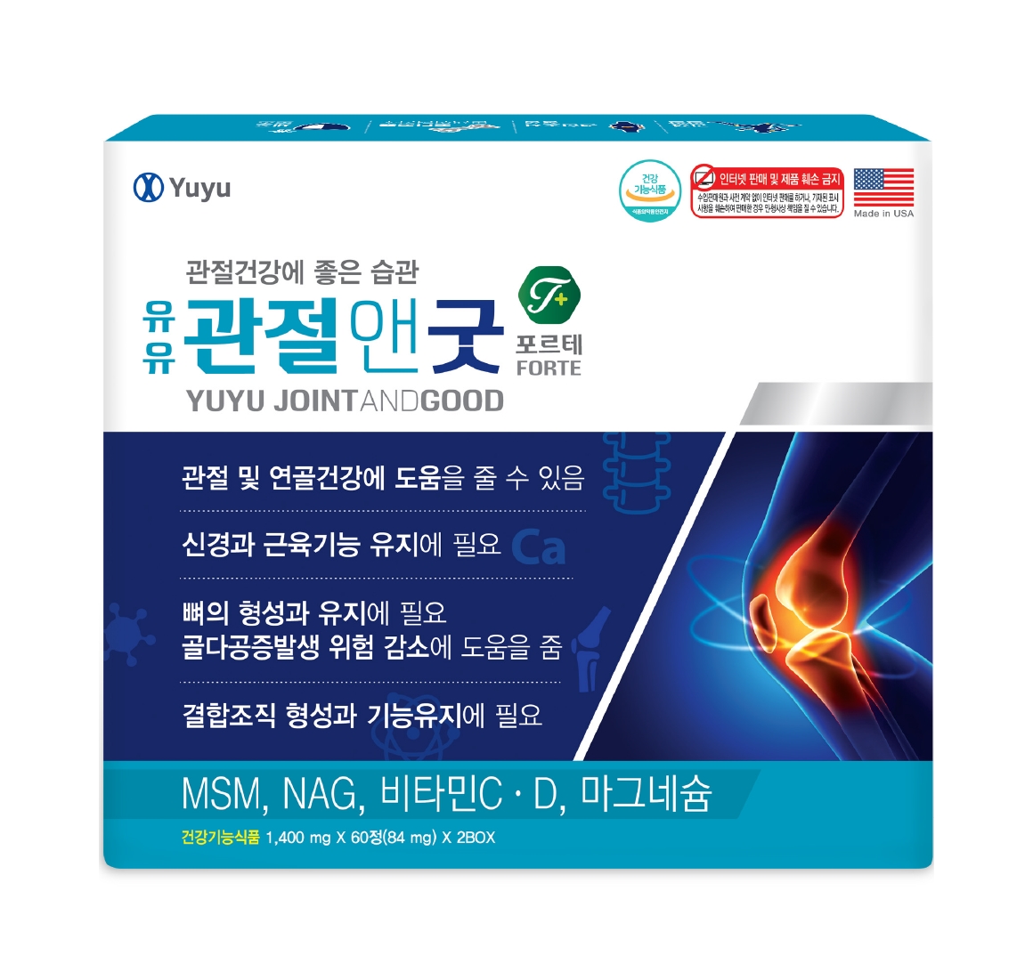 '유유관절앤굿'의 주성분인 MSM(식이유황)은 염증 관련 경로를 차단하는 기전으로 항염즘 효과가 있고 연골조직을 구성하는 황이 풍부한 원료로 연골생성에 도움을 준다. N-아세틸글루코사민은 연골세포를 자극해서 관절연골을 구성하는 세포외기질의 합성을 증가시키는 원료다. 이밖에 비타민C와 D, 마그네슘 등 신경과 근육기능 유지에 필요하고, 골다공증 발생 위험 감소에 도움을 주는 성분이 함유되었다.